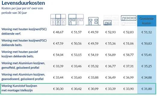 Voor het onderzoek werden vervolgens van zes types kozijnen de aanschaf- en onderhoudskosten over een periode van 30 jaar berekend en vergeleken.
